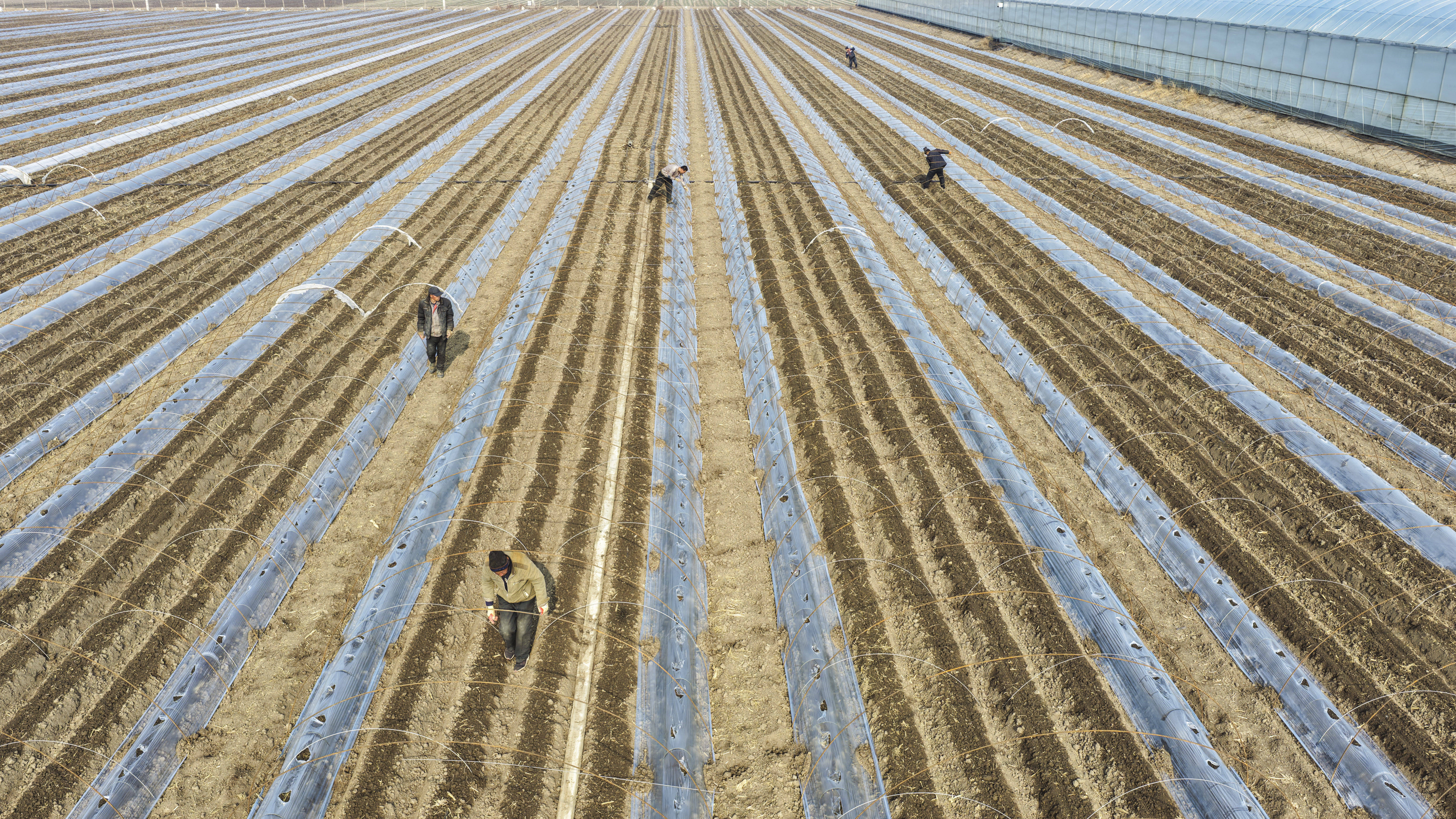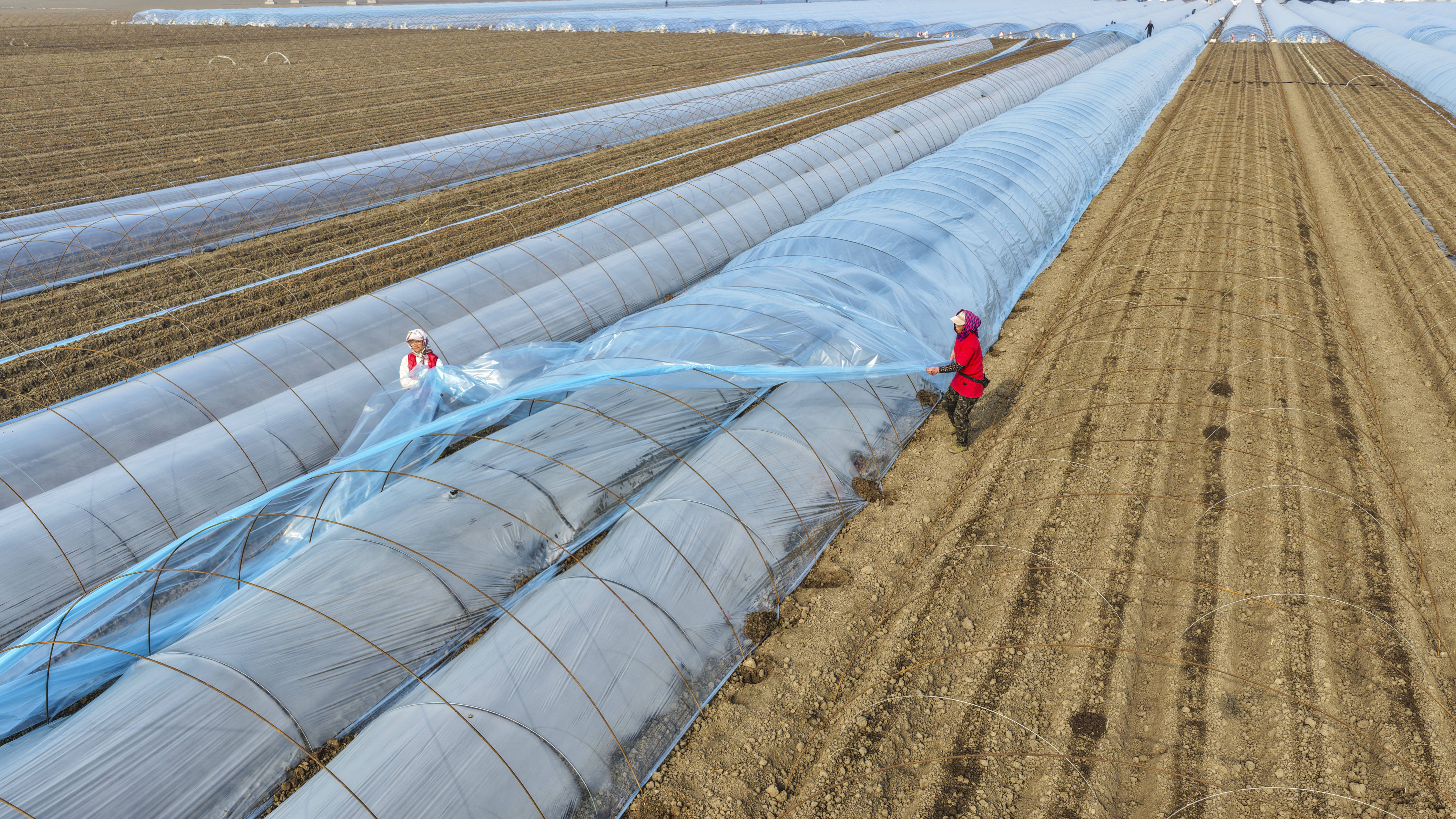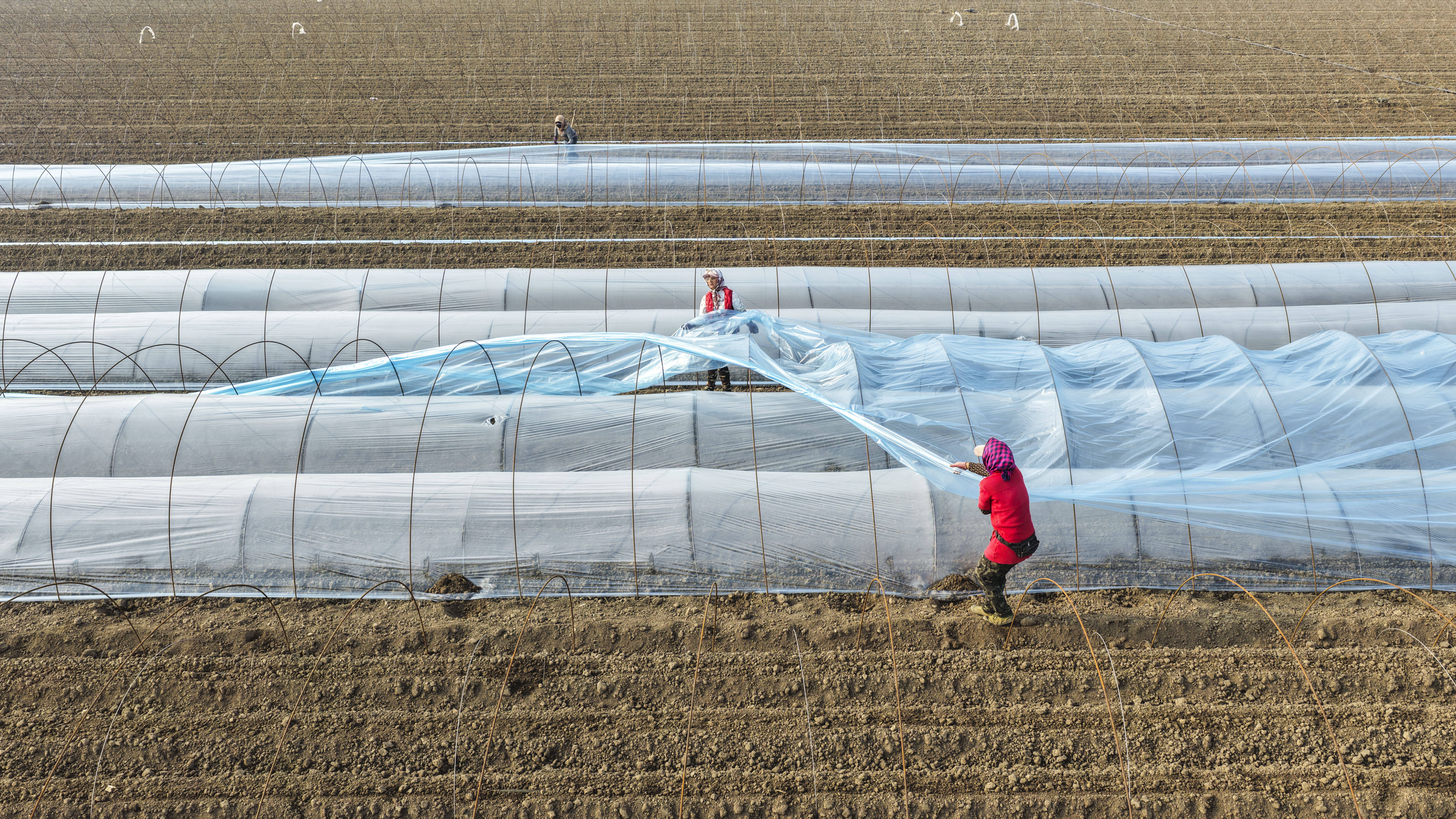 以上图片:2025年12月16日,在山东省东营市广饶县李鹊镇赵寺村的农田里,农民在为农作物搭建拱棚。(无人机照片)CICPHOTO/刘云杰 摄