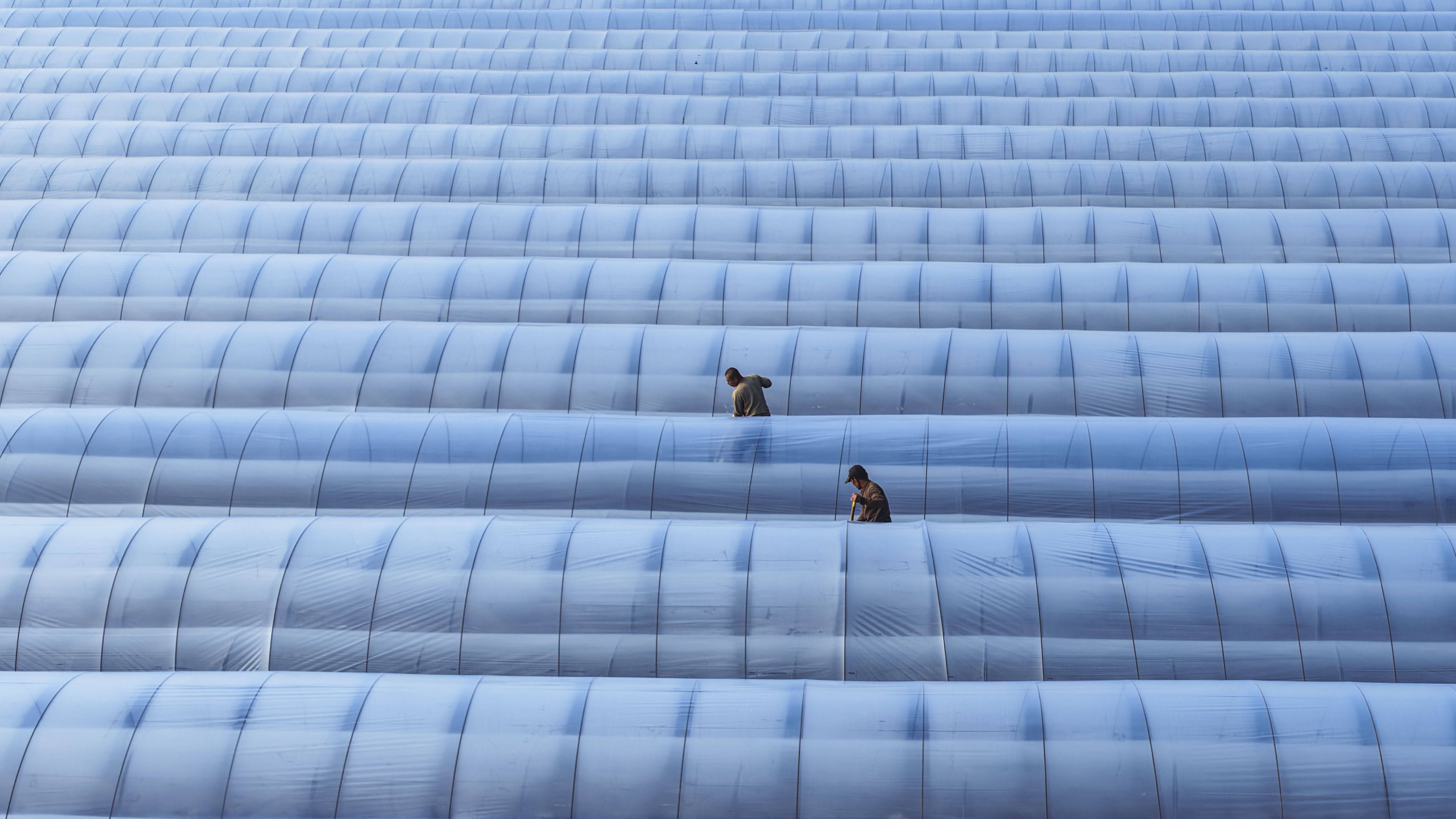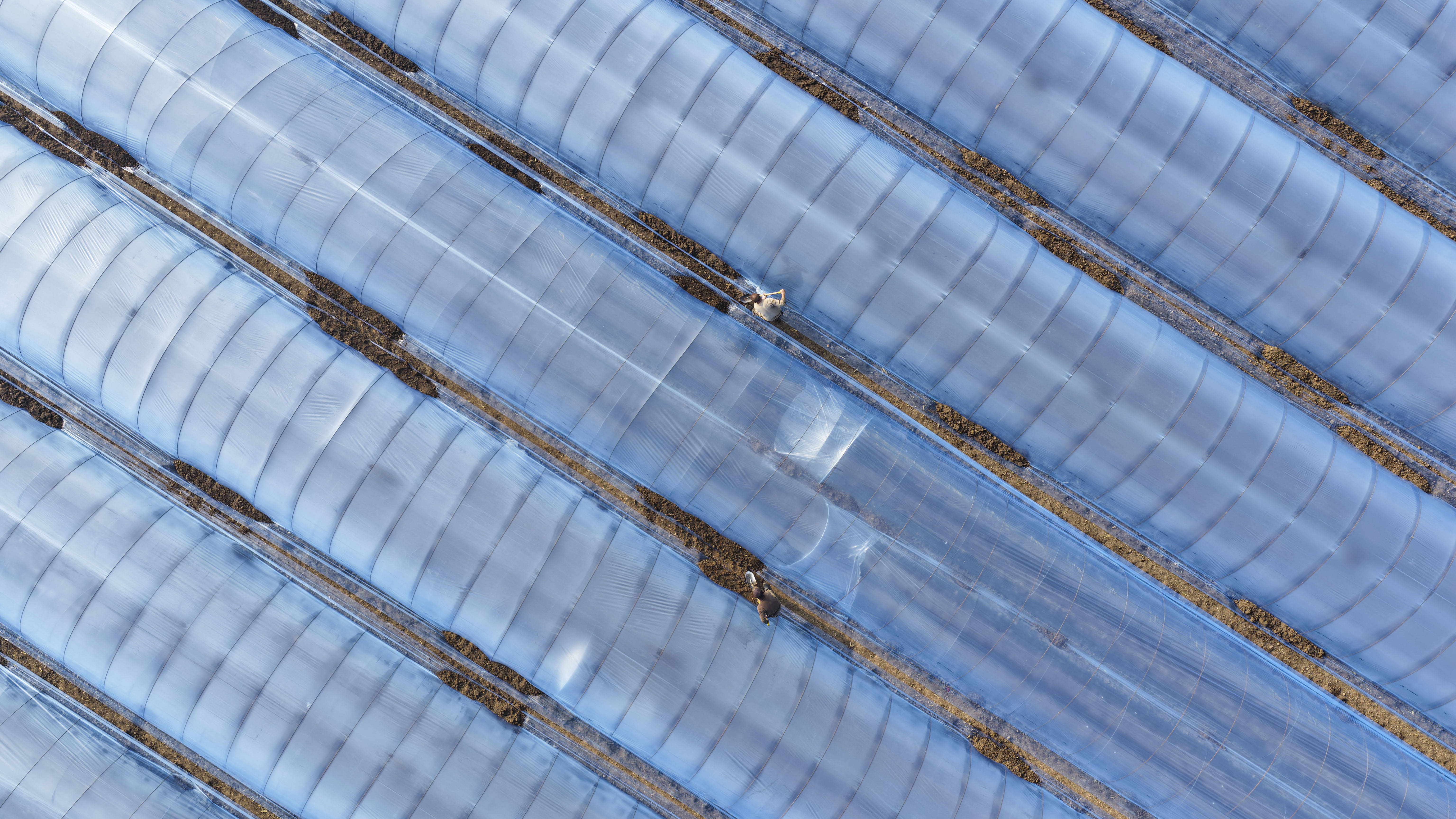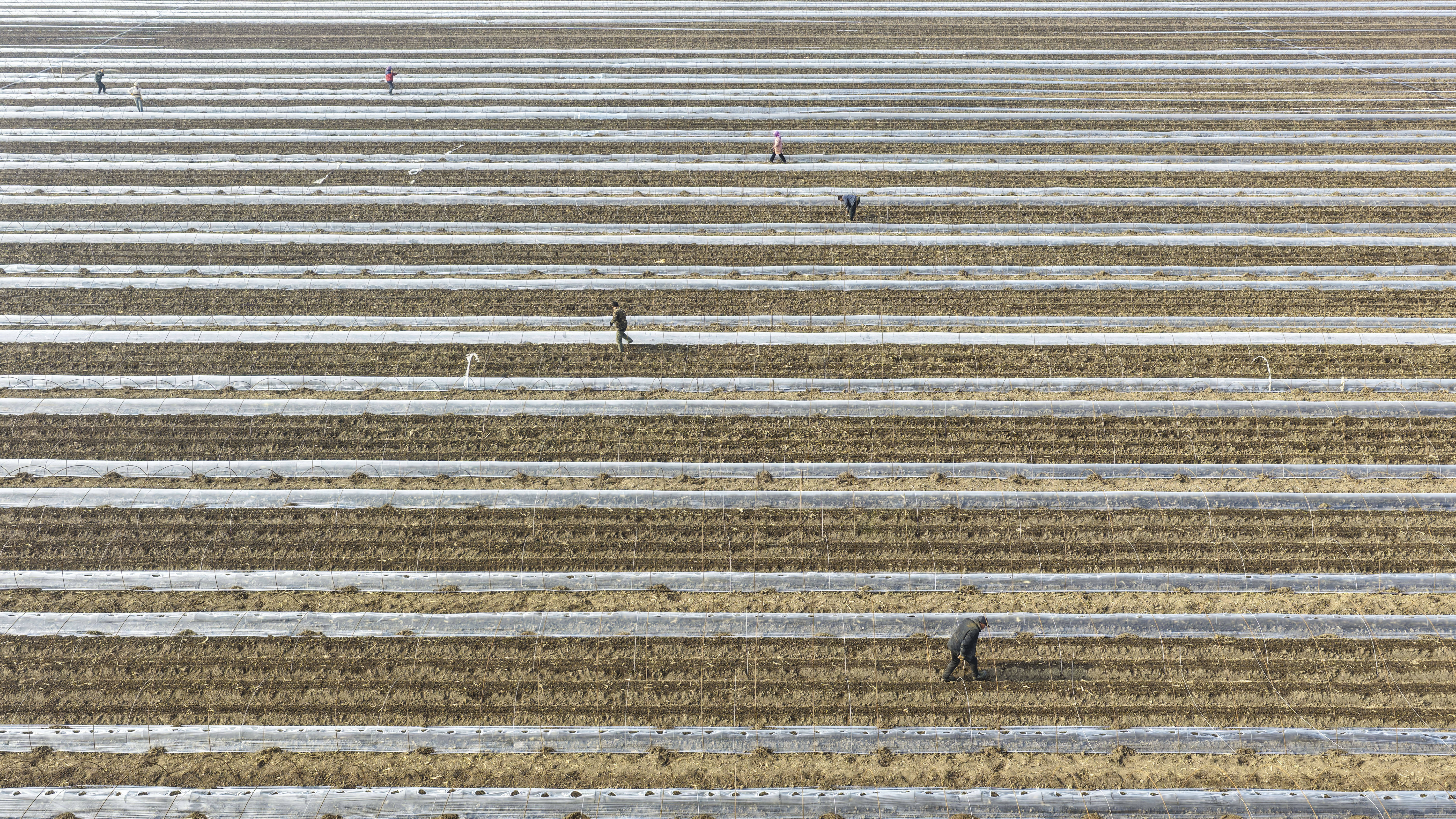 以上图片:2025年12月16日,在山东省东营市广饶县李鹊镇赵寺村的农田里,农民在为农作物搭建拱棚。(无人机照片)CICPHOTO/刘云杰 摄